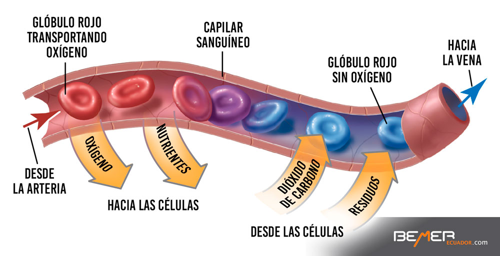 Los glóbulos rojos transportan oxígeno y nutrientes a través de las arterias y los capilares a todos los órganos del cuerpo. A medida que la sangre proporciona oxígeno y nutrientes a las células, las células a su vez transfieren el dióxido de carbono y los productos de desecho lejos de los tejidos a través de las venas y los vasos linfáticos.